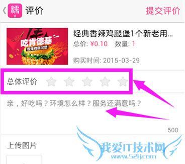 3、打开了“评价”的详细手机界面后,先在“总体评价”上,点一下星星,给多少星就点第几个。接着在文字提示内容一栏里输入自己想要发表的有关这个订单的话语。