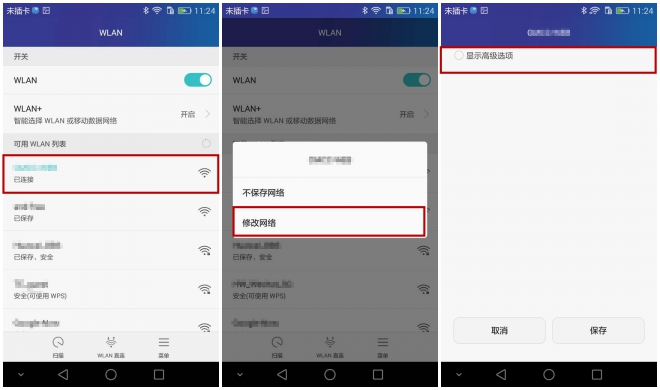 打开你的WLAN设置界面,长按你已经连接的网络,将出现一个界面,点击【修改网络】,选中【显示高级选项】。
