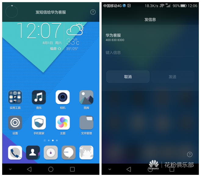 最后说的自然就是每天社交喽。想打电话给朋友又或是给朋友发送短信。Diang的一下,就可以。拿短信为例,长按智灵键,diang声出现后,“发短信给华为客服”即可进入与华为客服短信聊天页面。