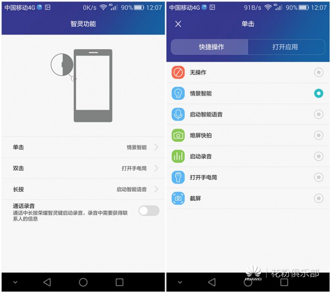 当然,荣耀7智灵键不止这么简单,通过设置,它还可作为更多快捷功能使用。例如我们可以设置单击为熄屏快拍功能。熄屏快拍是EMUI的快速拍照功能。从唤醒熄屏快拍功能到拍的一张照片大致需要1秒钟左右,对于那些转瞬即逝的有趣场景,还是相当有用的。