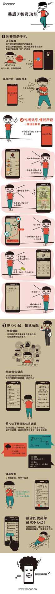 怎么样,荣耀7的智灵键的使用是不是很简单。只要长按智灵键,听到diang后,说出你要做什么,它就可为你完成操作。傻瓜式的操作方式,就能为我们提供丰富多彩的生活,还是很方便的吧。给你一张图,这里有详细的荣耀7智灵键具有的功能,码起来吧。