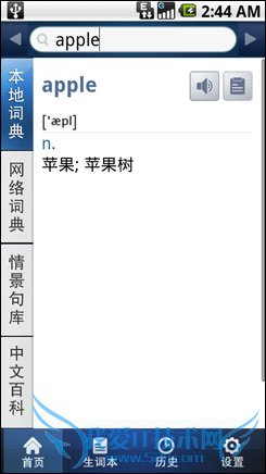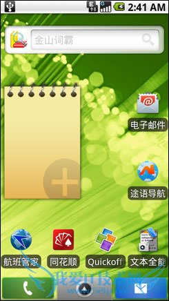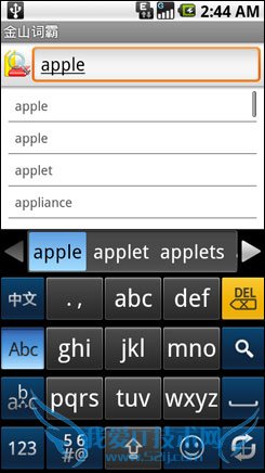 七、内置多款实用软件 摩托罗拉XT806内置了多个软件,而且大部分都是十分实用的。下面就给大家介绍几个常用软件。 1、金山词霸 笔者认为手机端的字典确实是一个十分伟大的应用,特别是对于学生用户来说,免去了随身携带字典、电子词典的不便,一部手机在手即可以查询单词。对于大部分的手机来说,要查单词首先要进入菜单,打开金山词霸软件,才能输入要查询的单词,但笔者认为这样还是太麻烦了。