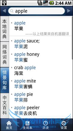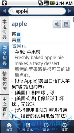 摩托罗拉XT806内置的金山词霸功能,把软件之间植入到主屏幕窗口小部件,要查询单词,直接在主屏幕的金山词霸小部件输入即可。点击更多更是有更详细的解释,例句、联网查询等一应俱全。