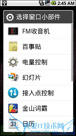 5、丰富的窗口小插件 Android系统为用户提供了窗口小插件功能。同样是在主屏幕点击菜单键,打开隐藏菜单,选择——添加——窗口小部件,就会展开所有可添加的窗口小部件包括 FM 收音机、百事贴、电量控制等,都是比较实用的工具。而且Android2.1将原来的三个主屏幕增加到了五个主屏幕,更多的空间给用户自行设计个性实用的主屏幕功能。