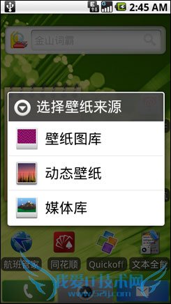 4、超炫但耗能的动态壁纸 摩托罗拉XT806搭载的Android2.1系统新加入了动态壁纸功能,让用户告别沉闷的背景图片,让主屏幕更有动感,更具个性。在主屏幕的界面中,点击左下方的菜单键,就会弹出隐藏的菜单,选择壁纸——动态壁纸即可以选择心仪的动态壁纸装饰主屏幕。