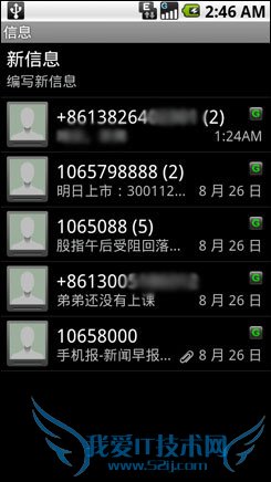 而且在任何一个界面都能通过下拉展开状态栏,不必在收到短信时先退出到主屏幕再打开短信功能阅读短息,而是在状态栏中直接阅读,大大提高了手机的使用效率。 3、会话式短信功能 摩托罗拉XT806的短信功能不像是大部分的手机那样,只是简单的以接受时间的顺序排列,而是采用了效率更高的会话形式。就像是即时通讯软件那样,以对话的形式按不同的联系人分成不同的窗口,使得用户更有效率地管理短信,而且使用短信功能时也更为方便。