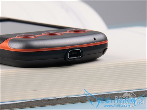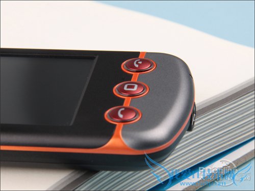 屏幕下方则是三个物理按键,分别对应拨号,Home键和挂机的功能。中键的Home键用于在待机界面和主菜单进行切换,或是从任意程序里快速返回主菜单。这三个按键选择了橘红色的原型突起设计,手感偏硬但是使整机风格显得更加活泼动感。