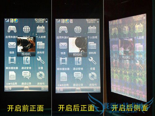 相比起摄像头800万像素这样强大的配置,夏普SH6320C的屏幕显得有点底气不足。如果把2.9英寸屏幕放在其他品牌的机型上,或许还说得过去。纠结的是夏普除了摄像头,屏幕才是最让用户看重的因素(不然夏普电视也不卖那么贵了)。夏普SH6320C搭配了2.9英寸WQVGA(240×400分辨率)日本原装的液晶显示屏。在色彩显示方面同样表现出色,只是颗粒感有点明显。 六、防止窥视的视角控制 这是一向会在夏普手机的屏幕上出现的功能。当不想让周围的人看到画面的内容时,启用彩色视角控制(Color Veil View),可以防止从上下左右各方向的窥视。用户只需按下放偷窥键就能开启在屏幕上预设好的图案,该图案的原理是通过角度控制达到只有在屏幕正前方才能清晰的观看到屏幕上显示的内容的目的。