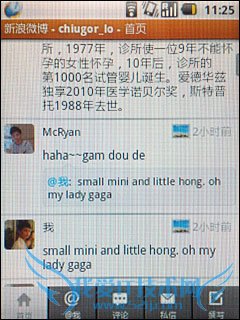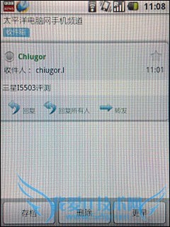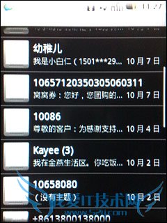 三星GT-i5500在短信功能方面同样延续了Android的新特性。改变了以往需要进入收件箱逐条信息阅读的习惯,整个新的界面已联系人为主导方面,改为时下非常热门的对话方式界面。点击进入短信界面,除了首行的编写新短信外,下面的都是每个联系人的短信内容,相当于每个独立的对话框,只需点击进入就能看见整个对话的内容,点击下方的输入栏则能快速进行短信编写。 |