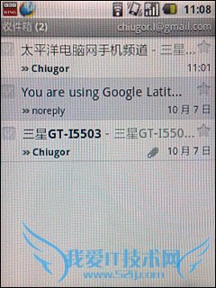 七、齐全的Google应用服务 Google带头研发的操作系统当然少不了其自家的一系列应用程序。三星GT-i5500内置了Google maps、Gmail、Google talk等应用。以Gmail为例在对方发送邮件过来后三星GT-i5500就会在消息栏上显示,就像我们平时收到短信时会有提示一样。而Google maps将会与GPS这对好弟兄一起介绍。