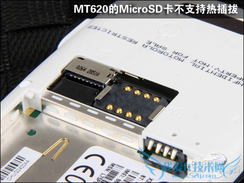 在笔者看来,摩托罗拉MT620的内存卡槽设计有点不太合适,因为当用户更换内存卡时就不得不拔电关机,掀开手机后盖,而摩托罗拉MT620的手机后盖对于没有留手指甲的用户来说很难掀开,而且还加大了电池盖的磨损,如此一来确实给用户增添麻烦了。>> |