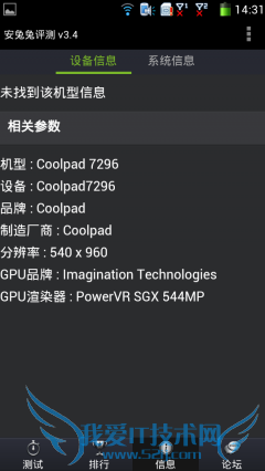 介绍完外观及系统后,下面我们在来看下酷派7296的硬件部分。酷派7296搭载了1.2GHz主频的联发科MT6589M四核处理器,内建PowerVR SGX 544MP GPU核心,并搭载1GB RAM以及4GB ROM。那么它的性能表现如何?下面我们就采用三款软件对其进行测试。