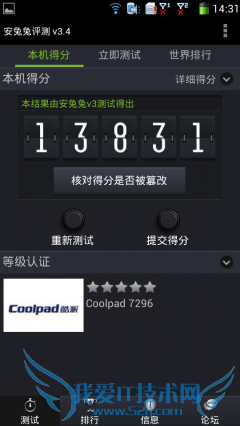 酷派7296采用的联发科MT6589M四核处理器,在安兔兔测试项目中,总分跑出了13831分,在四核处理器中达到了主流水平。