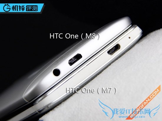 ▲M8的机身底部为3.5mm耳机接口和microUSB接口,而M7则是microUSB接口和麦克风口。