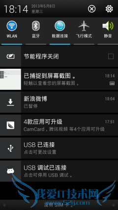 HTC One M8的通知栏界面有所改进,顶部通知栏和底部虚拟按键栏都改为透明背景处理,可以与桌面进行很好的过渡。但是在形式上,通知栏依旧延续了M7的设计,默认页的上部分为快捷设置,下部分为通知内容。