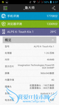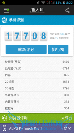 天语Kis1在鲁大师手机版上的最终得分17708,同安兔兔一样鲁大师给出的性能得分也让我们看到了天语Kis1不错的表现。
