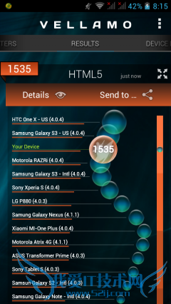 天语Kis1在Vellamo上的得分则为1535,其整体得分只略低于美版2GB内存的三星GALAXY S3,整体表现十分不错。
