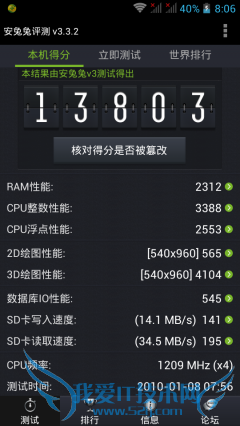 超级兔子系统评测AnTuTu Benchmark是一个专门给Android系统的手机、平板电脑硬件跑分的软件,它能一键运行完整测试项目,通过内存性能、CPU整数性能,CPU浮点性能、2D、3D绘图性能、数据库I/O、SD卡读、写速度等多项性能测试,并对手机的整体和单项硬件性能做出评分。同时上传分数并查看该设备在世界的排名。