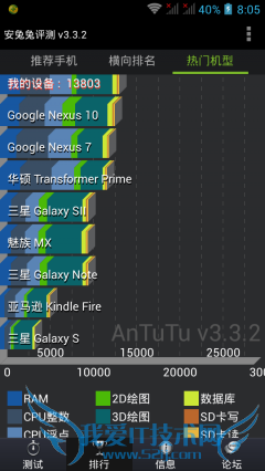 之所以将AnTuTu的成绩放在第一位,是因为它不仅能够展现硬件的综合实力,同时还提供细分项成绩,可进行对照参考。RAM表示机器的对于数据运算的吞吐能力、CPU整数/浮点性能代表处理器的运算能力、2D/3D绘图性能表示图形处理芯片对图像的渲染能力、数据库I/O性能表示处理器与RAM对数据库的访问效率、SD卡写入/读取速度则表明机身ROM的可读写能力(目前该项测试需要ROM空闲空间大于300MB,因此若机身存储空间/ROM不足300MB,则忽略该项成绩,但总成绩要扣除相对应分数)。理论上分数越高,则表示该项性能越强。