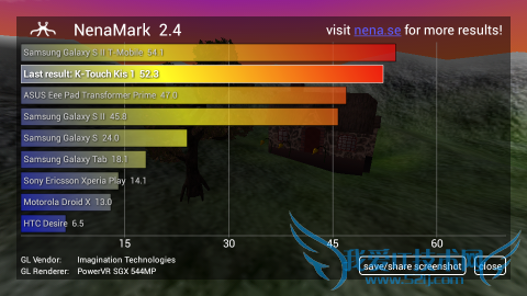 NenaMark是一款面向Android智能手机的图形处理能力测试工具,通过一段视频Demo的播放测试手机图形处理单元的硬件加速能力。其中Nenamark1适用于所有运行Android 2.x版本系统的终端;Nenamark2则适用于装备PowerVR SGX 540及以上图形芯片的高端Android设备。