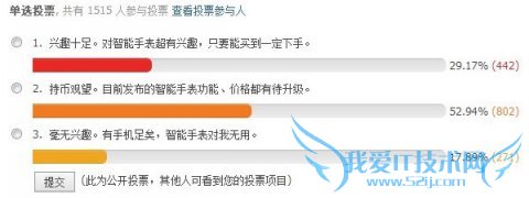 总结:我们曾在我爱IT技术网论坛做过一次智能手表购买需求的调查,有近30%的用户表示会购买,还有52%的用户在持币观望中,可见用户对于新兴产品的关注度还是比较高的。但目前市场上出现了很多质量低劣的产品,建议消费者购买正规大品牌产品,不要花冤枉钱买到无用品。