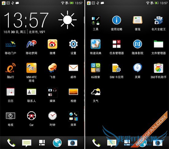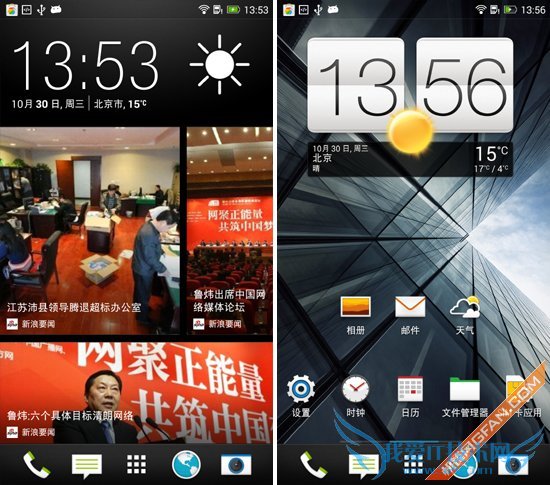 操控界面:除了聚合资讯页面外,HTC One也拥有主页+抽屉的操控形式页面,主页可以摆放快捷方式和小工具,抽屉里可以查看、管理手机中的所有应用程序。此外,在这两个页面下,消费者都可以通过叠加应用图标来进行文件夹创建,这样在软件管理上非常方便。