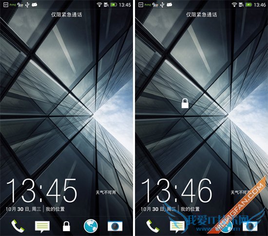 锁屏界面:默认以蓝天大厦为锁屏背景,信息显示和快捷图标都集中在屏幕底部,通过上划时间、图标来进行解锁和开启应用。此外,这款手机支持指纹解锁,可以通过触控机身背面的识别区来进行快速解锁。