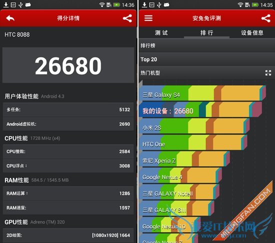 安兔兔得分:26680,热门机器排名在三星S4接近,成绩很少出色,可以和八核配置的三星S4相媲美。
