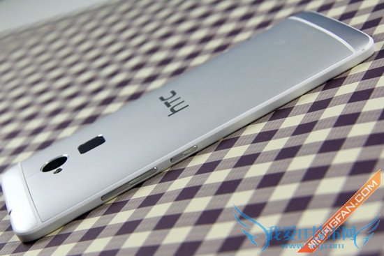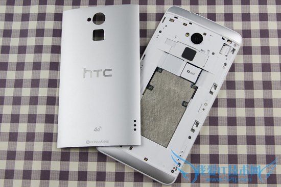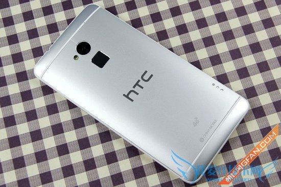 机身的背面设计也与One一样,上中下三段式设计,全金属的后盖、支持拆卸,与市面上的塑料外壳手机相比,HTC One max极具质感,显得格外高端大气。背面的布局是:上方是400万的主摄像头、LED补光灯、指纹识别区块;中间是HTC标志;下方是4G标志、中国移动标志、三枚金属触点。