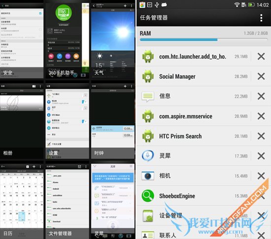 任务管理:双击HTC One max上的主页按键,能够启动系统内置的任务管理器,该页面采用了九宫格卡片式设计,分别显示着当前系统运行的应用程序缩略图,通过上滑卡片即可关闭后台程序。