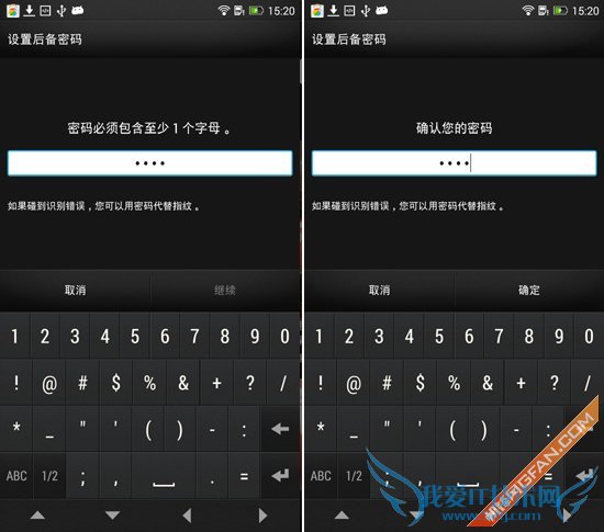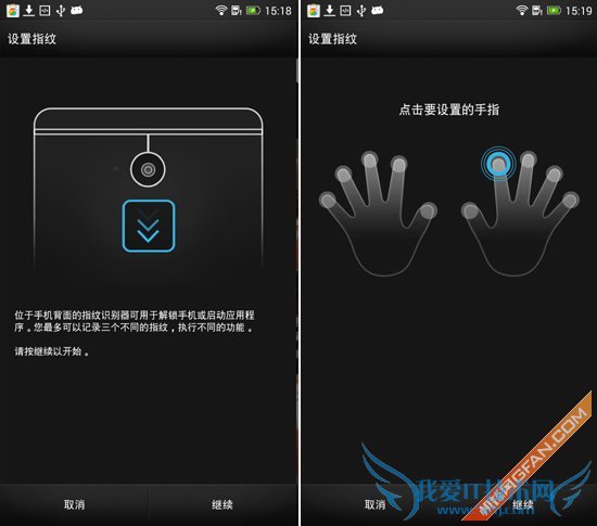 设置指纹:在系统设置中有指纹设置选项,在这里系统会通过教程方式来引导消费者设置指纹识别,首先点击要设置的手指,然后在指纹识别区块上滑动扫描四次,最终完成指纹记录。为了防止指纹识别出现问题,系统还强制要求消费者设置后备密码。