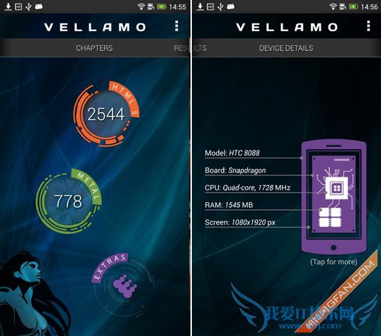 HTC One max VELLAMO成绩:HTML 2544、METAL 778