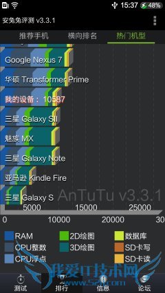 之所以将AnTuTu的成绩放在第一位,是因为它不仅能够展现硬件的综合实力,同时还提供细分项成绩,可进行对照参考。RAM表示机器的对于数据运算的吞吐能力、CPU整数/浮点性能代表处理器的运算能力、2D/3D绘图性能表示图形处理芯片对图像的渲染能力、数据库I/O性能表示处理器与RAM对数据库的访问效率、SD卡写入/读取速度则表明机身ROM的可读写能力(目前该项测试需要ROM空闲空间大于300MB,因此若机身存储空间/ROM不足300MB,则忽略该项成绩,但总成绩要扣除相对应分数)。理论上分数越高,则表示该项性能越强。