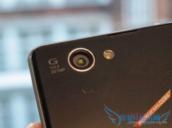 索尼Xperia Z1 Compact的机身后面,设计着一颗与Z1旗舰机一样的2070万像素摄像头,旁边为LED补光灯。