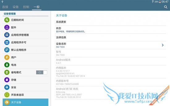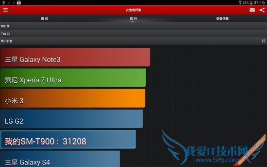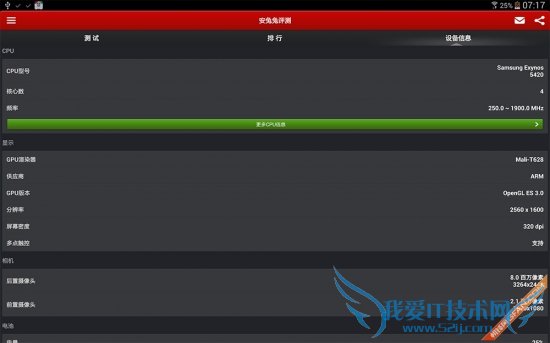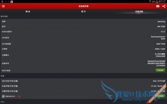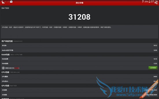 除了外观和系统出色外,三星T900的性能表现也非常彪悍。这款平板虽然没有搭载高通骁龙800系列处理器,但却采用了三星自家的4+4核处理器,型号是Exynos 5 Octa,主频分别是1.9GHz+1.3GHz;内置3GB RAM+16GB ROM的存储组合。接下来笔者将通过各项软件来对其进行跑分测试。
