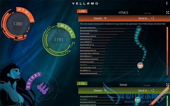 Vellamo是由Qualcomm(高通公司)开发的一个基准测试应用(类似于Neocore),它可以让你对手机浏览器的性能及稳定性进行测试,包括像Java脚本性能、渲染、联网和用户界面等。该工具的结果同样包括多个子项,但我们只取总成绩,分数越高则表明手机对浏览器的优化程度越高,网页浏览体验更好。