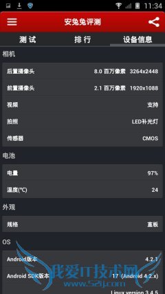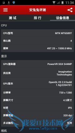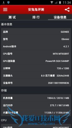 介绍完外观及系统后,下面我们在来看下ELIFE E6 mini手机的硬件部分。ELIFE E6 mini手机搭载了1.5GHz主频的联发科MT6589T四核处理器,以及PowerVR SGX 544MP GPU,并搭载1GB RAM以及16GB ROM。