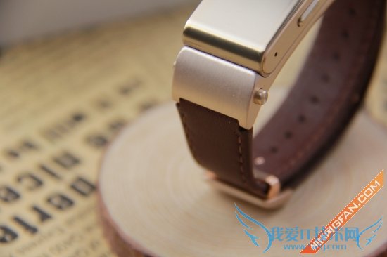 说完手环主体我们接下来看看华为手环B2的表带。可以看到承载手环的底盘设计依然十分精致,磨砂质感配上“TALKBAND”的Logo看上去非常具有商务气息。此外欧洲上等头层牛皮材质制成的表带也为华为B2手环增加不少奢华感,不得不说真皮材质摸上去还是非常舒服的,并且表带的处理也十分用心,表带的边角都有经过处理,也没有所谓“跳线”现象出现。另外要说明的是,华为手环B2的表带是15mm的标准表带,这意味着用户可以购买市面上其他表带来进行自由更换。