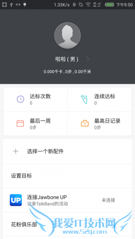 点击右上角的选项按钮,就能进行手环管理。在这个界面用户可以看到手环的连接情况,剩余电量等信息,同时可以进行手环提醒功能管理以及更新手环固件。点击左上角的头像便能对用户的基本信息和运动状况进行设置和查看。