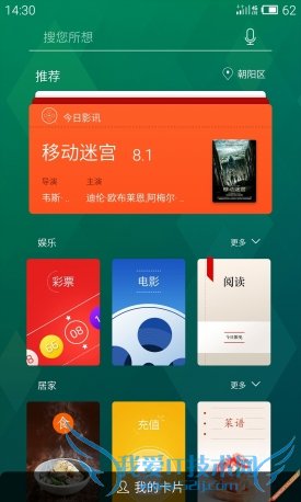 而这一功能体现在Flyme上时,用户只需要将屏幕拉到最左屏,便可以看到卡片状的YunOS服务,用户仅需通过这些卡片便可以享受到一系列日常生活服务。其中非常值得一提的是,Flyme powered by YunOS当中一共内置了29个生活服务卡片以及一个推荐卡片和一个搜索工具。