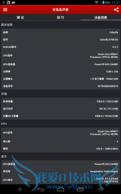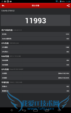 通过几款常见性能检测软件的测试,我们可以看到Colorfly E708的跑分成绩与全志A31s方案机型的普遍测试结果相类似, Colorfly E708并未在芯片性能上有任何缩水的地方。