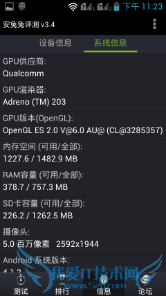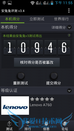安兔兔系统评测AnTuTu Benchmark是一个专门给Android系统的手机、平板电脑硬件跑分的软件,它能一键运行完整测试项目,通过内存性能、CPU整数性能,CPU浮点性能、2D、3D绘图性能、数据库I/O、SD卡读、写速度等多项性能测试,并对手机的整体和单项硬件性能做出评分,同时上传分数并查看该设备在世界的排名。联想A760得分为10946,虽然是四核且跑分过万,但与目前市场主流四核手机还是有一定的差距。