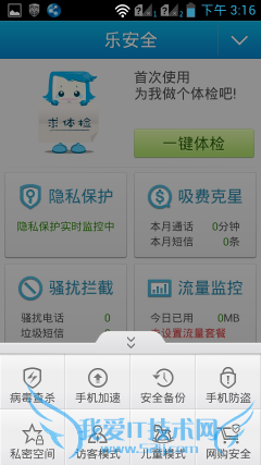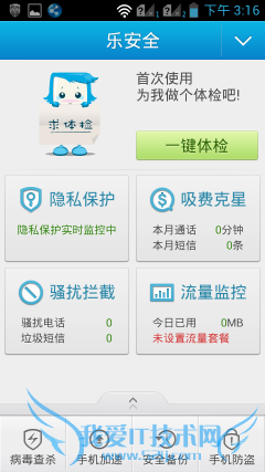 乐安全:可排查手机健康隐患,一键优化加速,清理病毒。黑名单功能,让垃圾短信和骚扰电话不再出现;手机丢失可以找回通讯录等数据,更可以远程遥控擦除所有数据,信息不泄露。儿童模式、访客模式防止误拨电话误发短信及隐私信息无意中泄露。