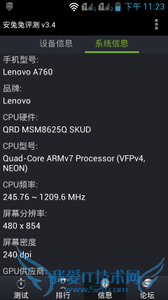 联想A760采用的CPU为高通骁龙SnapdragonMSM8225Q,这款CPU在四核当中属于高通家族入门级的产品。采用了Cortex-A5架构,28nm制程。主频达到1.2GHz,GPU采用的是Adreno203,最高可以播放720p的视频。一起通过跑分测试看看实际性能如何吧。