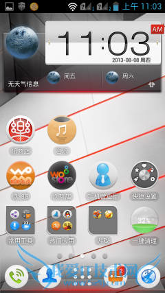 联想A760搭载Android 4.1.2系统,四叶草的概念在联想手机上逐渐淡化,不喜欢的朋友长按可以删除,图标依旧使用联想特有的圆形图标。