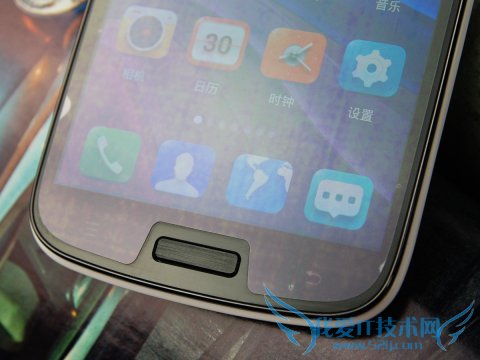 机身正面上方为听筒、感应器,并且配备了一颗130万像素前置摄像头,达到了HD 720P级别,78度超大广角,可以在多人自拍时拥有更广阔的的视野。在屏幕下方则是三个Android常规按键,中间HOME键为实体按键,HOME两侧为虚拟菜单、返回键,在背光熄灭时虚拟键可以完全隐藏。