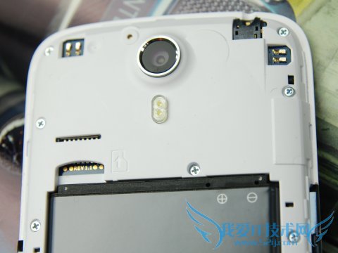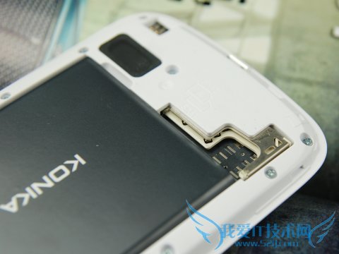 在机身右侧底部可以看到打开后壳的凹槽,拆开机身后壳可以看到双标准SIM卡槽,用户并不需要剪卡即可直接使用。此外,康佳凡高V981还设计了Micro SD卡槽,对于手机容量有更高需求的用户可以以更低的成本得到更多的容量。