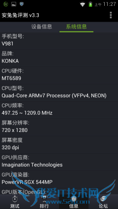 康佳凡高V981内部搭载一颗联发科 MT6589四核处理器,主频为1.2GHz,并配备1GB RAM。一起通过跑分测试看看实际性能如何吧。