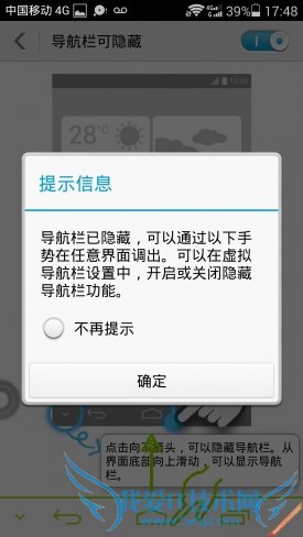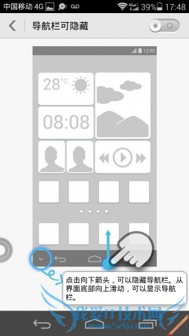 华为P7依然采用了屏幕内置虚拟按键,这样的设计令很多用户头疼,但是该机可以从设置中开启隐藏虚拟按键并且开启悬浮按钮,但既然选择了虚拟按键设计,就应该让用户可以自定义虚拟按键顺序,方便用户操作。