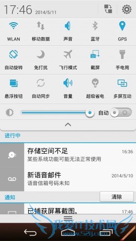 中兴星星1号通知栏也被分为了两栏,左侧为通知界面,右侧为快捷设置界面,虽然可以很全面的展现快捷设置,但是操作起来稍显繁琐。华为P7采用单页设计,在下拉通知栏中,众多快捷设置项罗列在此,并可对其进行自定义顺序。